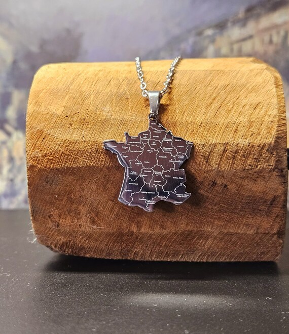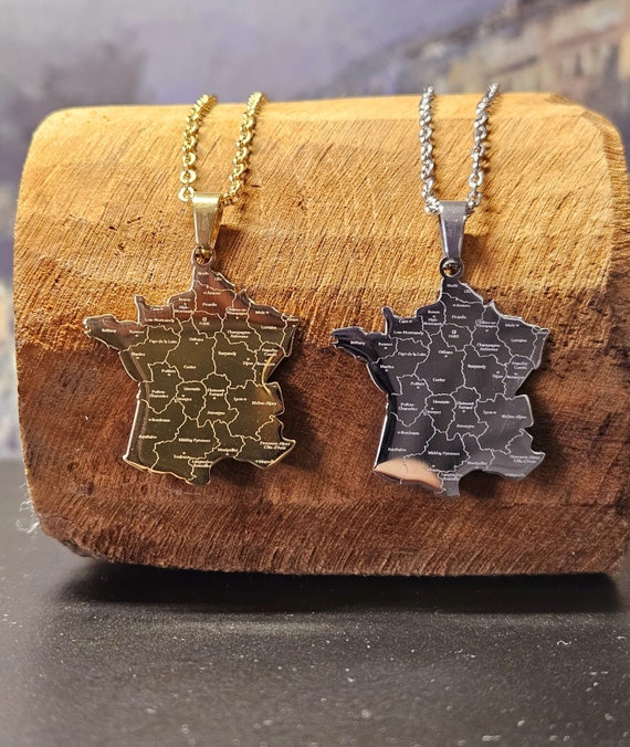 France Necklace Map Country Outline With Labels Gold Plated